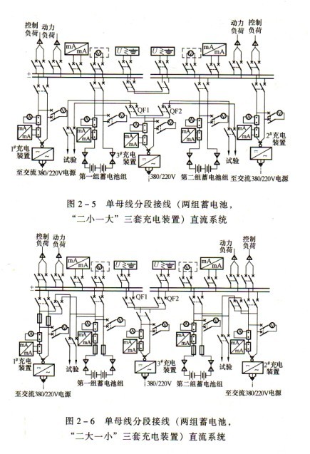 (3)方案三:單母線分段(一組蓄電池,兩套充電裝置)接線,見圖2-3。特點:接線可靠、靈活,一組蓄電池經兩個空氣斷路器分別接到兩段母線上。兩套相同容量的充電裝置接在不同